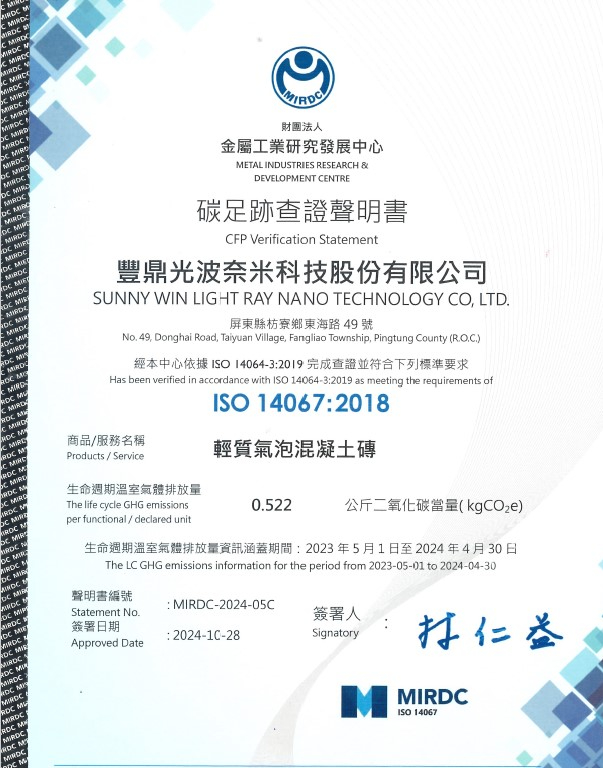 於2024下半年度完成ISO 14067碳足跡盤查,並取的盤查認證,碳排放量為 0.522 Kg/CO2e